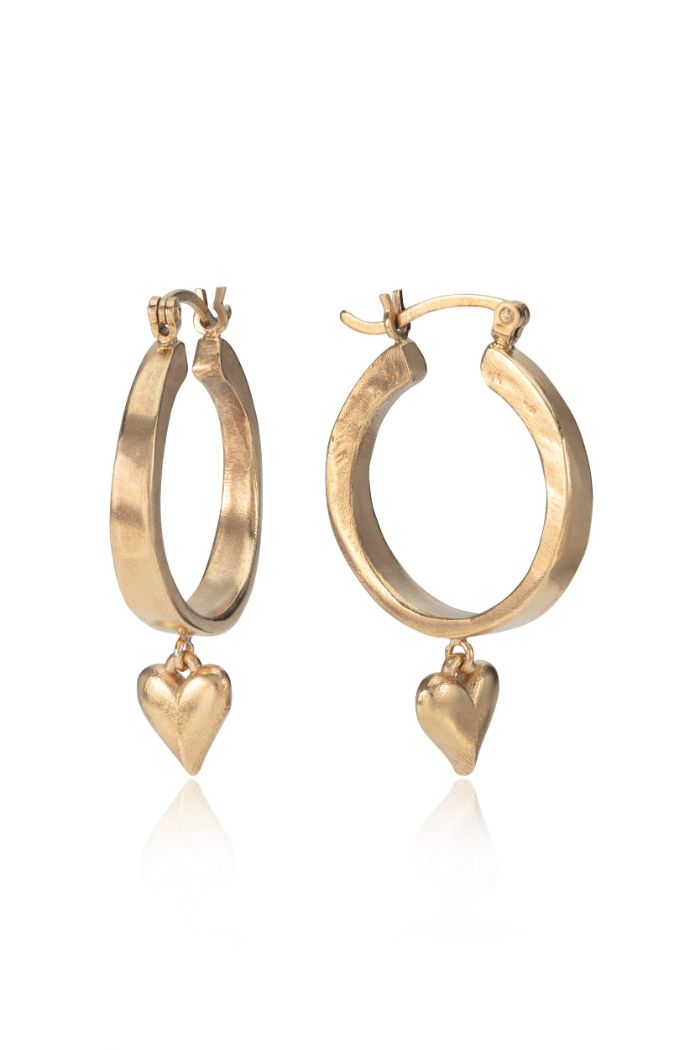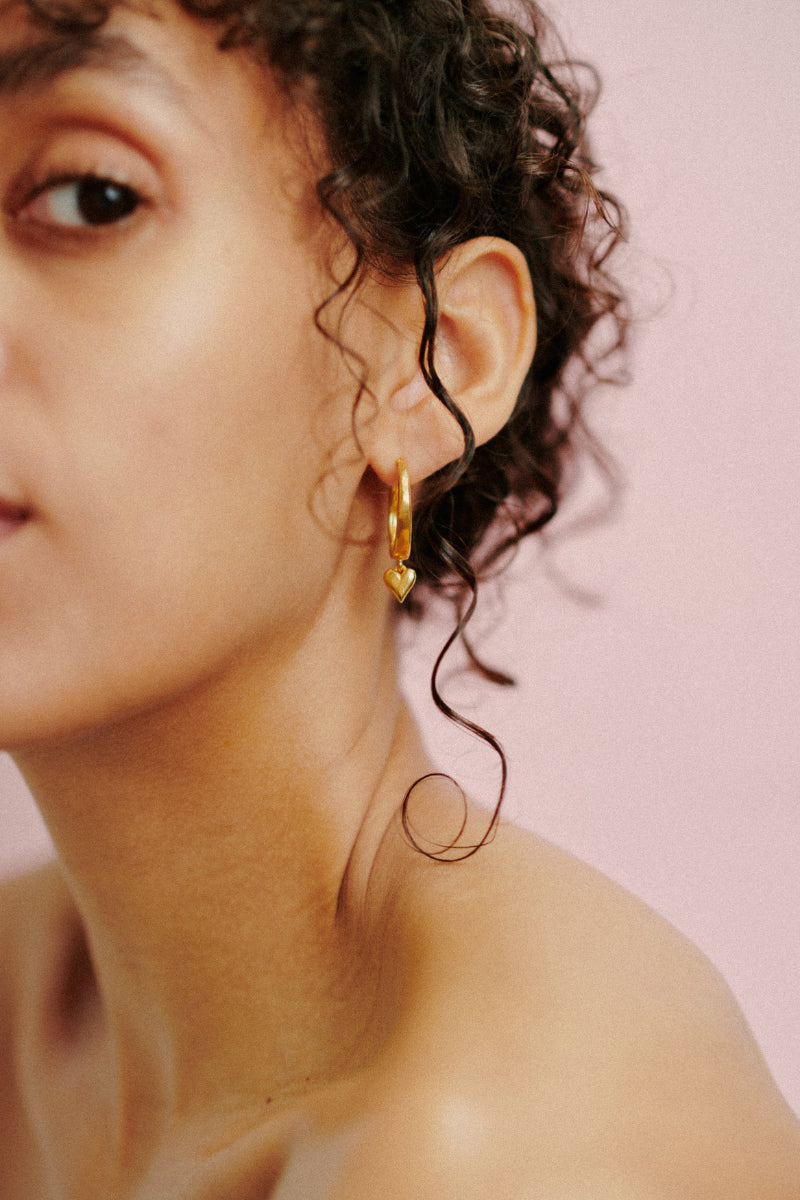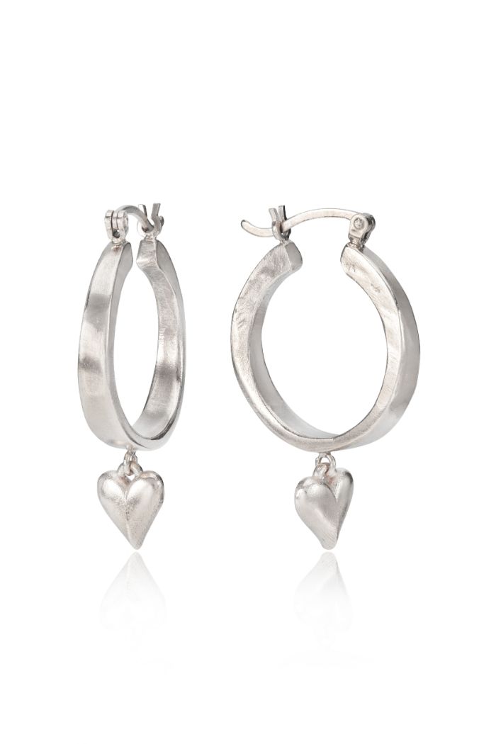 Hand forged dancing heart hoop earrings evoking a bohemian spirit and playful movement. Adorned with an elegant heart shape, the final detail is hand hammered in our studio with our synonymous rustic texture designed for the modern day wedding guest. Available in Gold & Silver. All of our gold plated pieces use Fairmined gold.