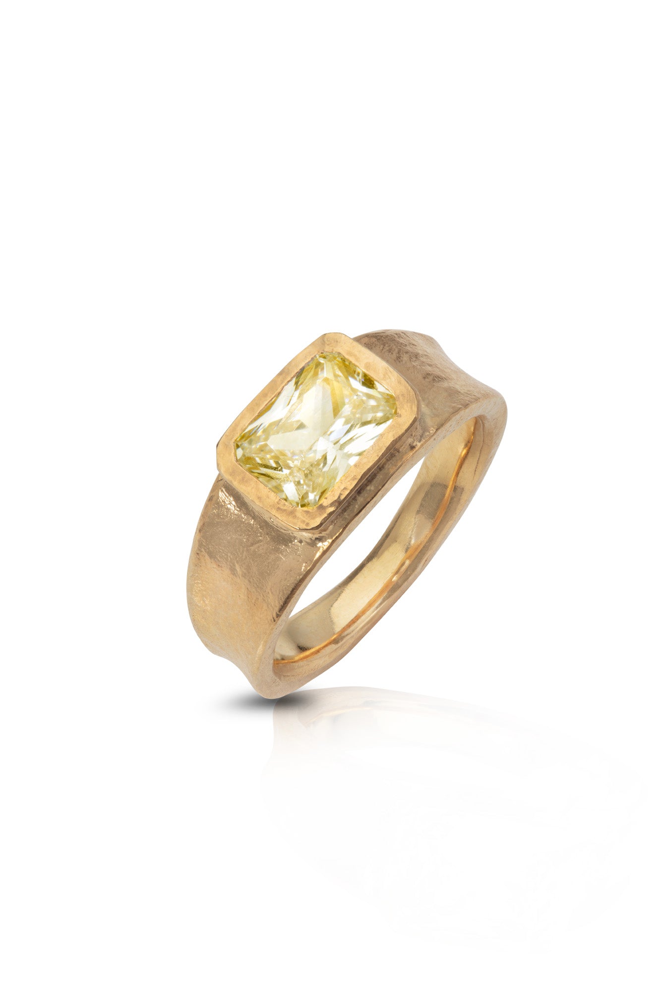 Applying the finest artisanal craftsmanship, this ring is hand forged in recycled solid gold and hand finished at the bench. Using Kitty's signature Bronze Age hammer technique, the ring is finished in the rustic texture you know and love.