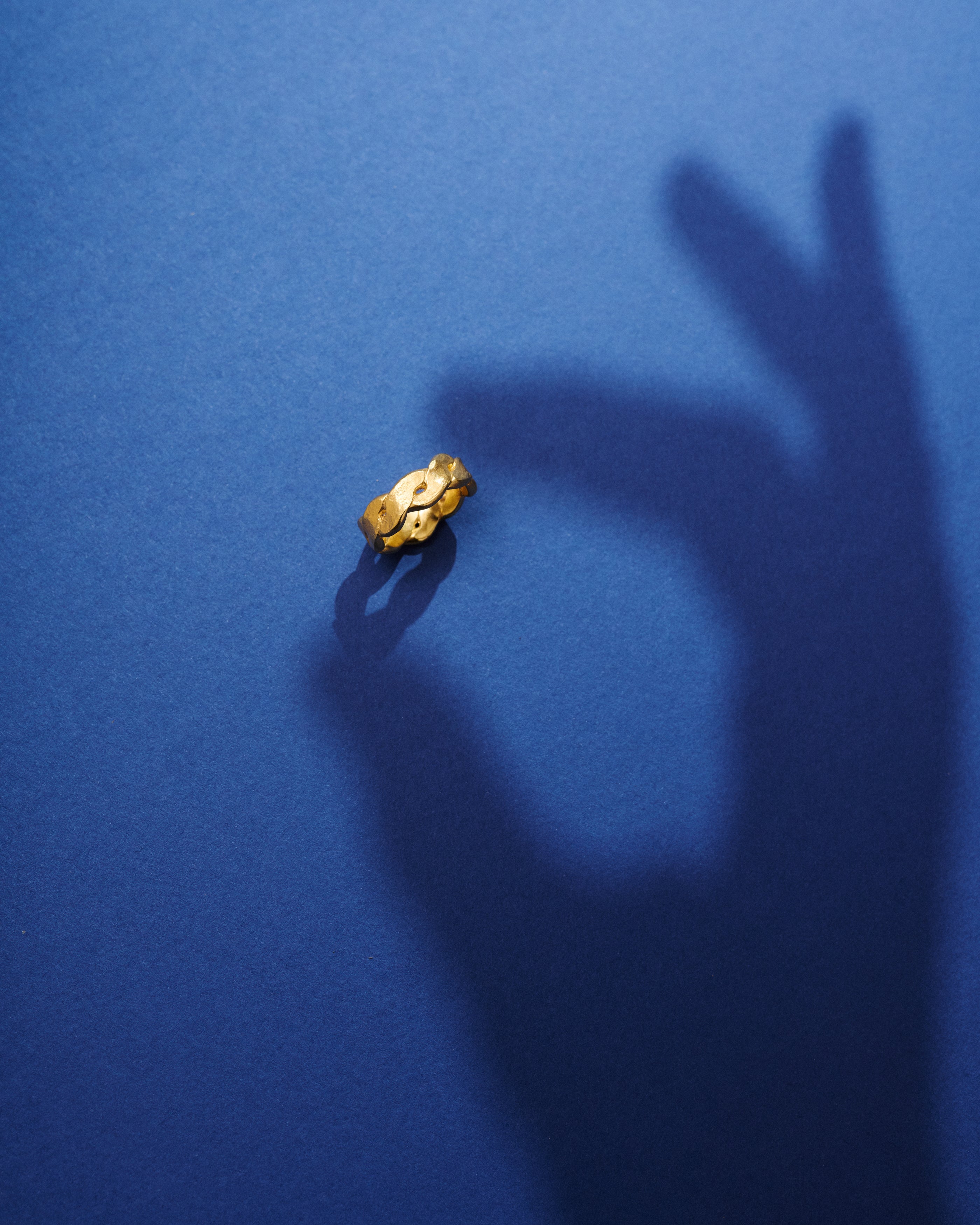 Each ring is hand-twisted and formed in our London studio, shaped from recycled sterling silver and optionally finished in Fairmined 18ct gold plating. The design was brought to life at the bench after months of experimentation - every curve and contour telling a story of its making. Heated, hammered, and refined entirely by hand, the result is a ring that feels raw yet refined, balancing imperfection and elegance in equal measure. Produced in minimal quantities, each piece is hand-finished using Kitty’s signature Bronze Age hammer technique, giving the surface its distinctive, textured finish.