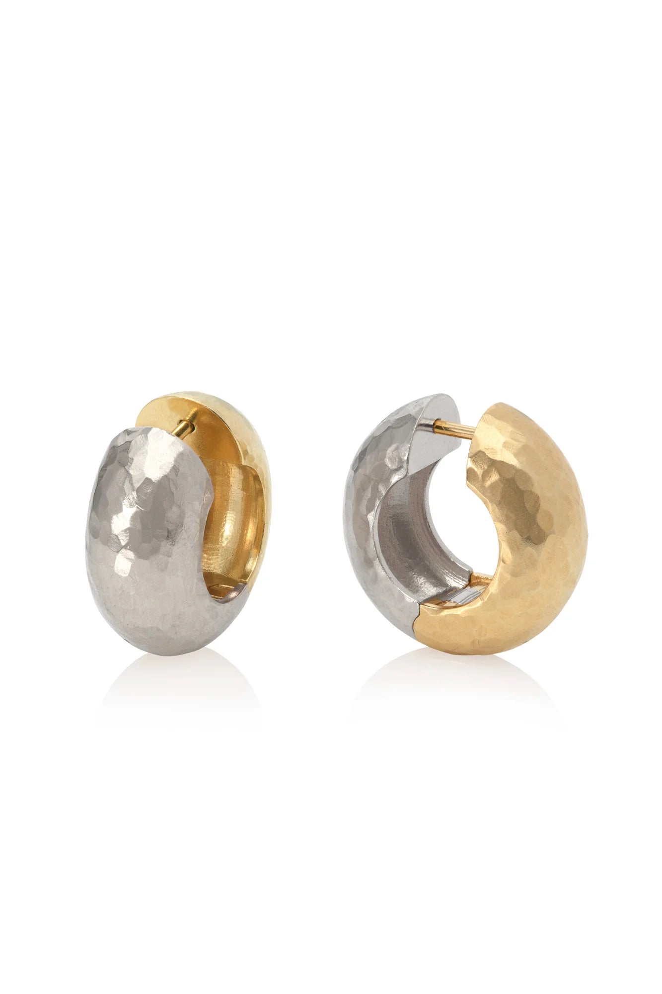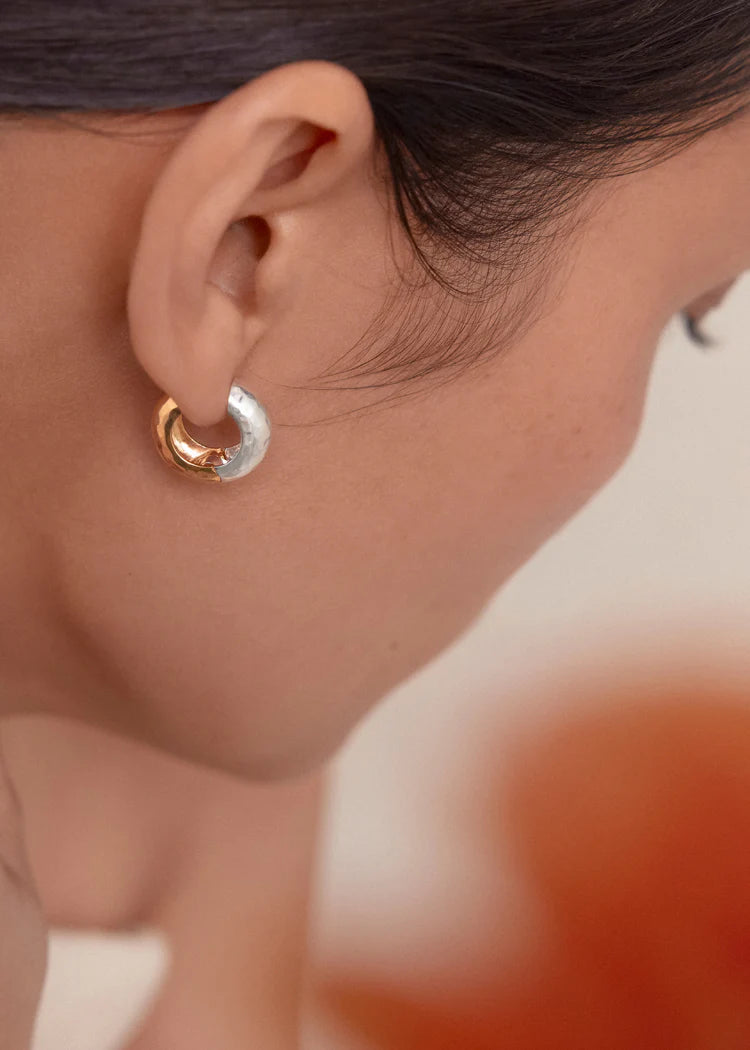 Meet your new go-to hoops, designed to act as the ultimate finishing touch from day to night. With our signature textured finish, these huggie hoops are unfussy, easy-to-wear classics for your forever jewellery box. Hand forged in solid yellow gold or combined with recycled sterling silver, they offer a playful, contemporary look. Each pair is handmade in our South London studio before being cast locally in Hatton Garden. They are then hand hinged, textured and polished up by Kitty and the team.