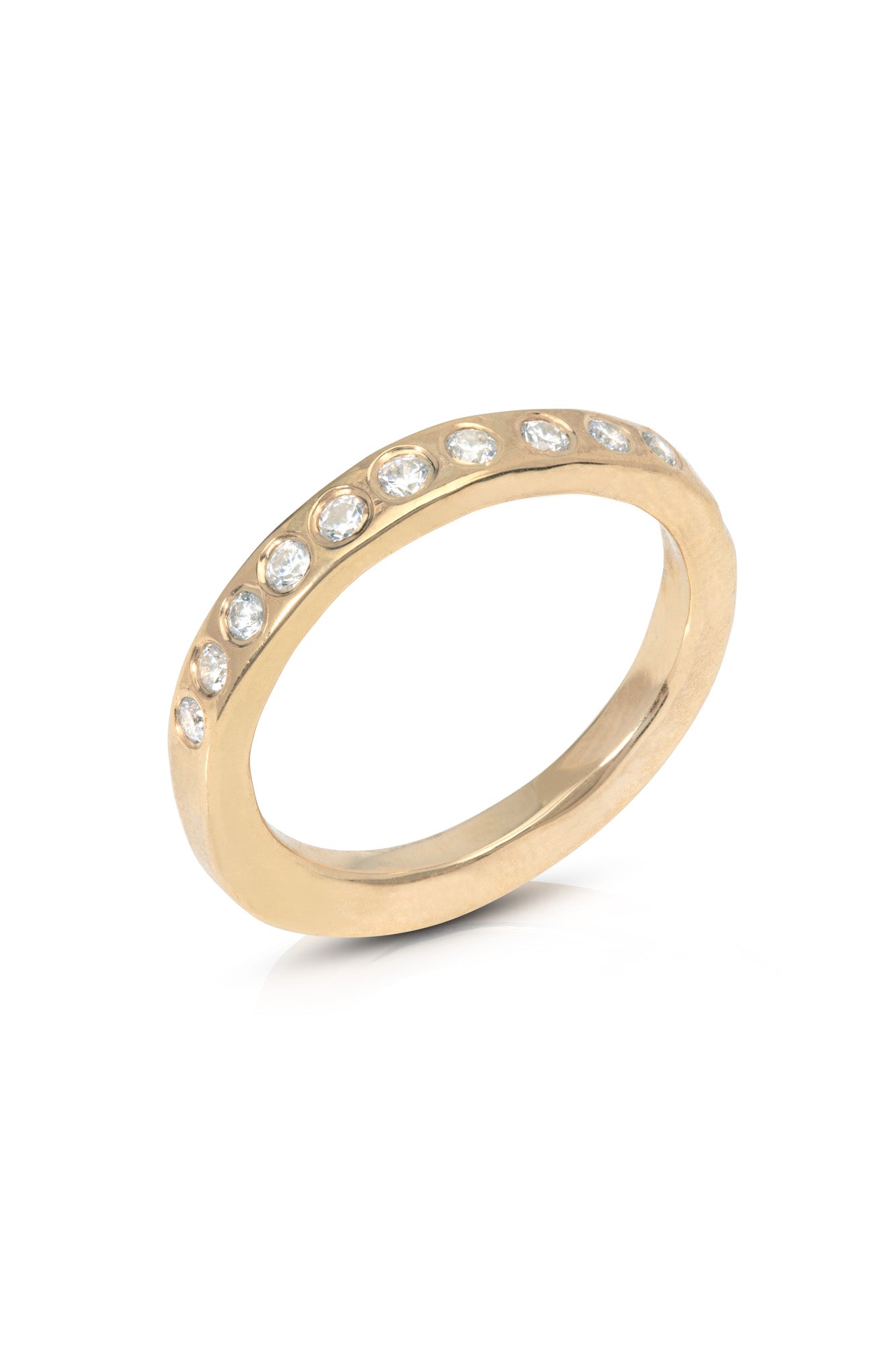 Meet our signature eternity ring, hand forged in solid gold with an ascending flush set of exquisite round diamonds. Featuring our textured, organic metal finish, created using Kitty's Bronze Age hammer technique, the Twilight Forged Ring reimagines the traditional diamond band, injecting Kitty's bohemian, romantic touches into a timeless design. Perfect for wearing alone, or stacking with other rings, this piece is handcrafted from wire using our Bronze Age hammer before being cast locally in Hatton Garden into recycled 14ct yellow gold.  Each diamond is then hand set by our stone setter, before being polished up and finessed in Kitty's South London studio.