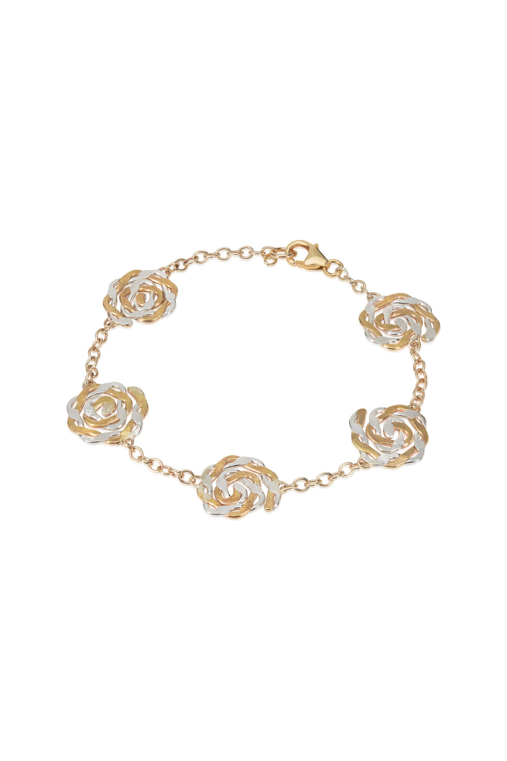 Handcrafted in our London studio, each swirl is meticulously made by hand using fine 14ct yellow gold wire twisted and forged with recycled sterling silver, soldered onto a delicate 9ct trace chain. Each piece is made-to-order and hand-finished using Kitty’s signature Bronze Age hammer technique, giving the surface that signature tactile quality that has become so synonymous with the brand.