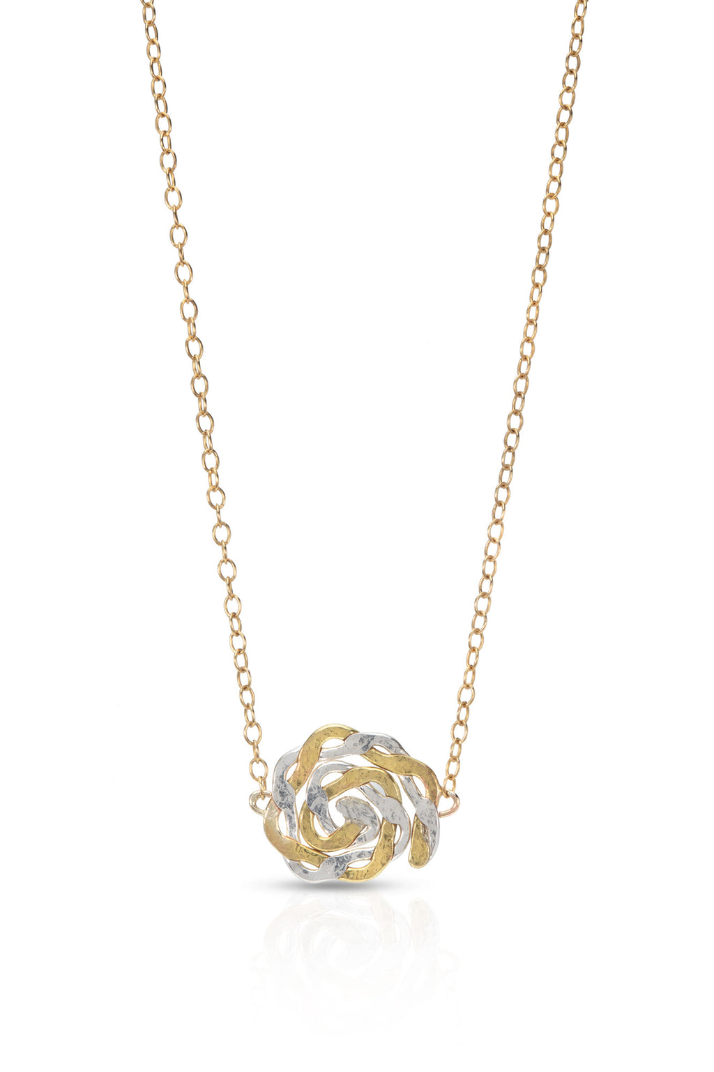 Inspired by the swirling motion of the cosmos, the Swirl Pendant transitions effortlessly from day to night, bringing otherworldly charm to the everyday. Celebrating the raw beauty of metal in its purest form, the pendant feature no stones, no embellishment, just refined craftsmanship and mixed metal magic.